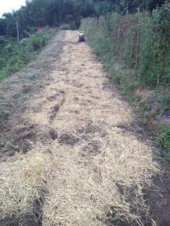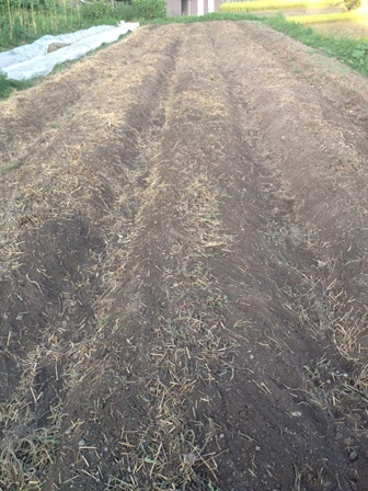 たっぷりワラを鋤きこんだあと、畝立てをし、