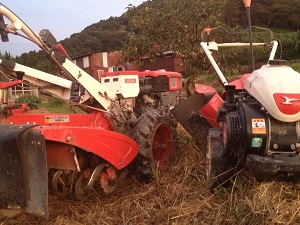 あすはこの大き方の耕運機で枯れ草を沢山鋤込み、ちっさい方で畝上げを