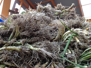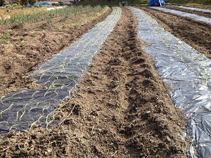 次に空けた穴に玉ねぎの苗を刺していきます。根が長いと刺しにくいので短く切り揃える作業です。