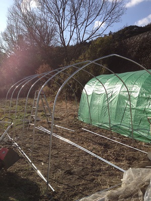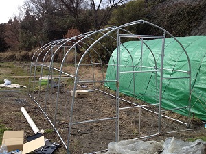 農業機械が増えてきたので今まで使っていたミニビニールハウスを倉庫にし、隣に育苗用の新しいビニールハウスを建てました。
