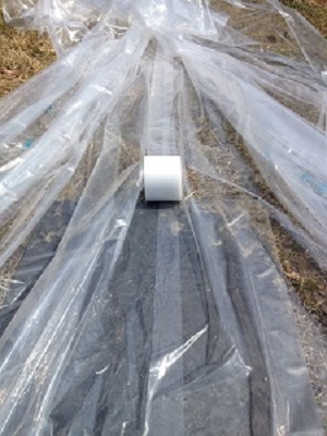 ビニールは1.8m幅のビニールトンネル用の残りを使いました。もちろん幅が足りないので真ん中をビニールハウス補修テープ(500円)で貼り合わせ3.6mにして天幕用のビニールにしてみました。