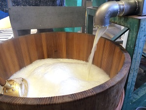 煮た大豆をこしきに入れ絞り、圧縮させるとおからと豆乳ができてきます。
