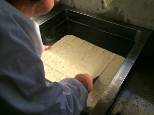 75度の豆乳ににがりを入れ分解してきたら豆腐箱移し、5キロのおもしをのせて10分おくと固まりました。