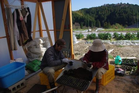 まず、ナスとピーマン、シシトウの鉢上げ作業をして頂きました。